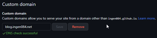 リポジトリを別のものにしたため、そのままサクッとカスタムドメイン名の設定を外してつけるだけでした。簡単だ…。
